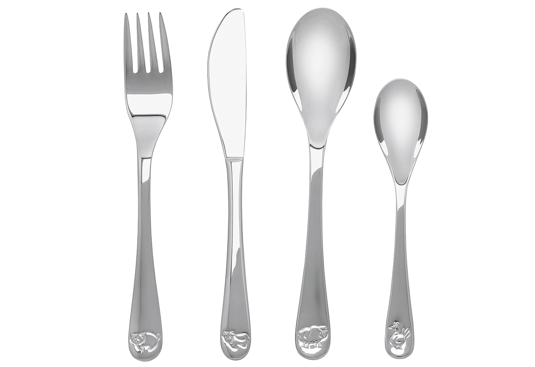 Zilverstad Kinderbesteck Bauernhoftiere, 4-teilig, Edelstahl 18/10, Inhalt 1 Gabel, 1 Messer, 1 Löffel, 1 Breilöffel, in Geschenkverpackung, spülmaschinenfest. Maße Gabel 170 mm, Messer 179 mm, Esslöffel 170 mm, Kleiner löffel 135 mm.